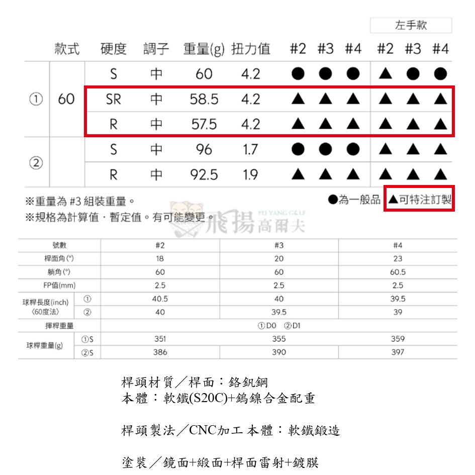 • neo 950 鐵桿身, 號數#2/角度18/硬度S neo 950 鐵桿身, 號數#3/角度20/硬度S neo 950 鐵桿身, 號數#4/角度23/硬度S