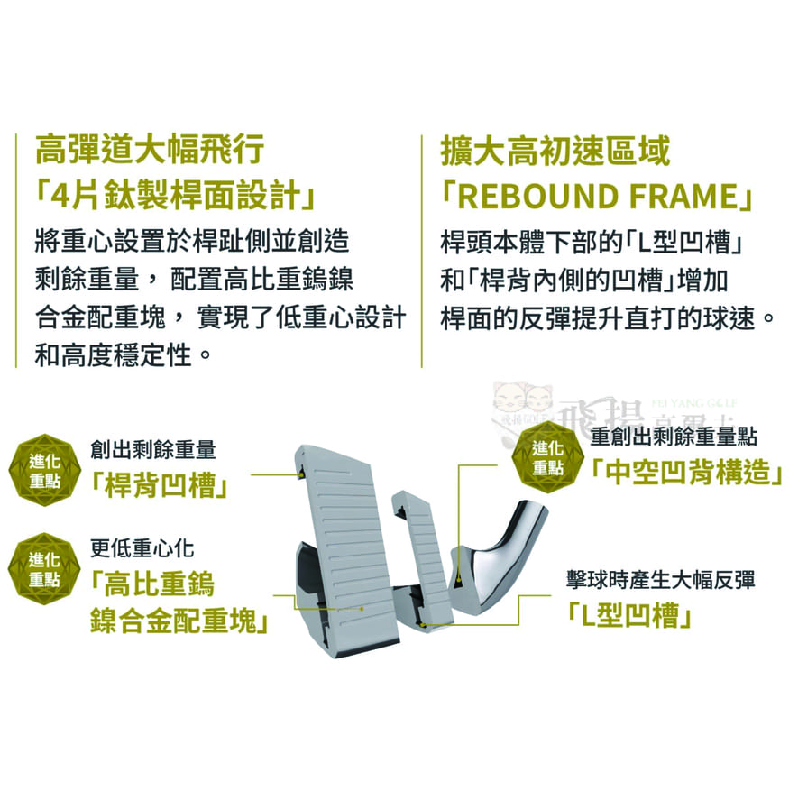 ⭐高強度薄型鈦製桿面的4片複合構造,強化的低重心設計和「REBOUND FRAME」,實現高彈道的穩定飛行距離和方向性。
