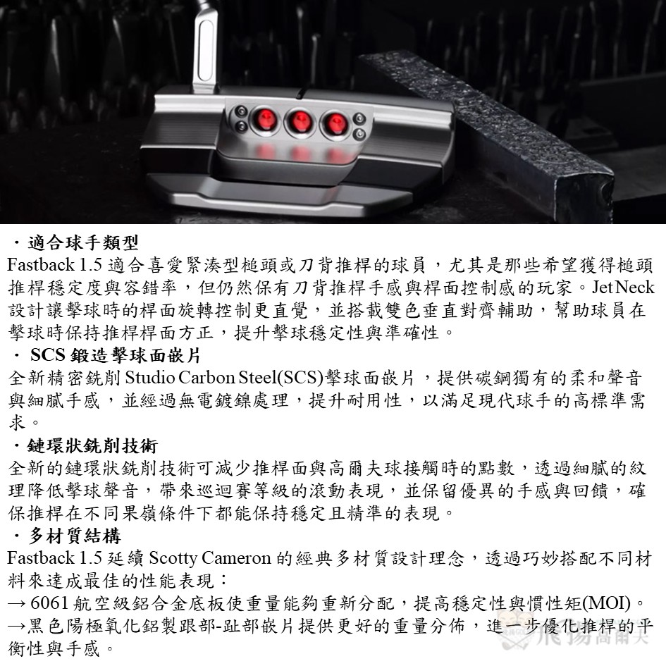 Fastback 1.5 採用 Studio Carbon Steel (SCS) 鍛造擊球面嵌片,並運用鏈環狀銑削技術,帶來柔和的擊球聲音與細膩的手感。其底部角度經過重新設計,確保推桿在擊球時能夠完美貼合果嶺,保持方正,進而提升擊球準確度與穩定性。