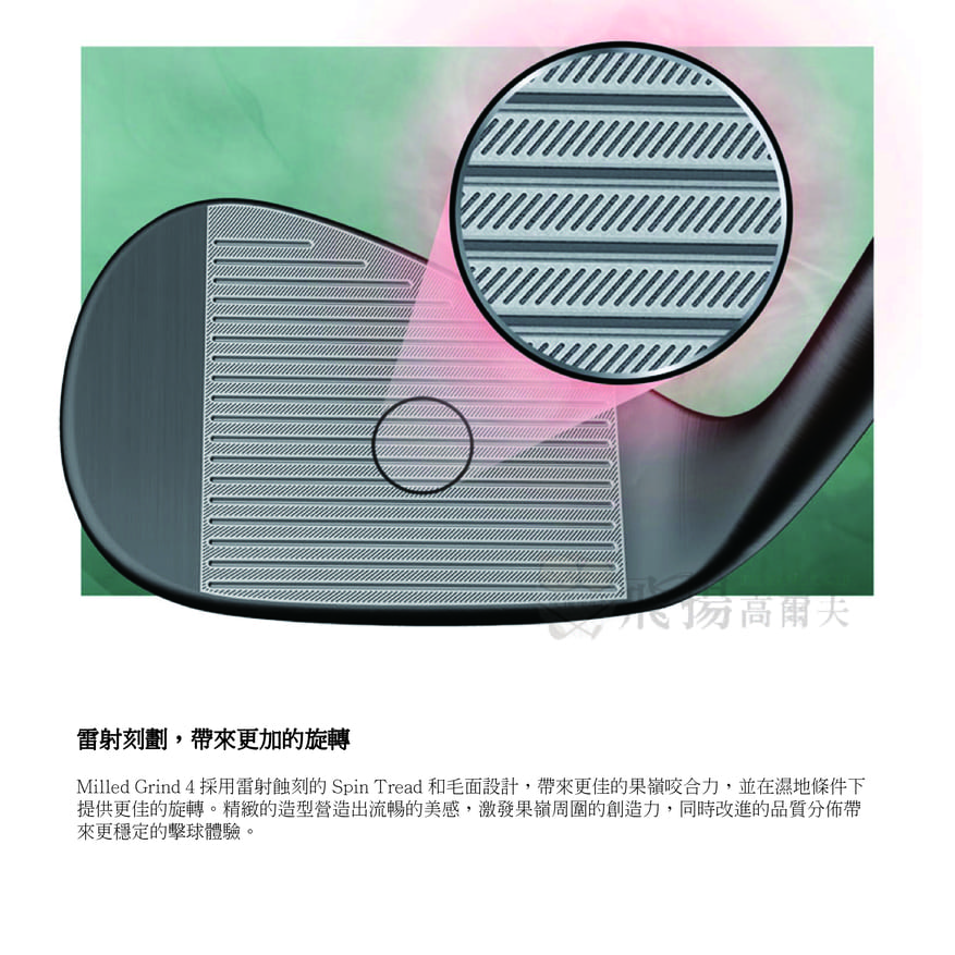 桿面溝槽之間加入獨特傾斜的斜紋雷射雕刻工法,藉以形成特殊凹槽通道,讓水分在擊球時能順利排出,保持在潮濕環境下的倒旋效果