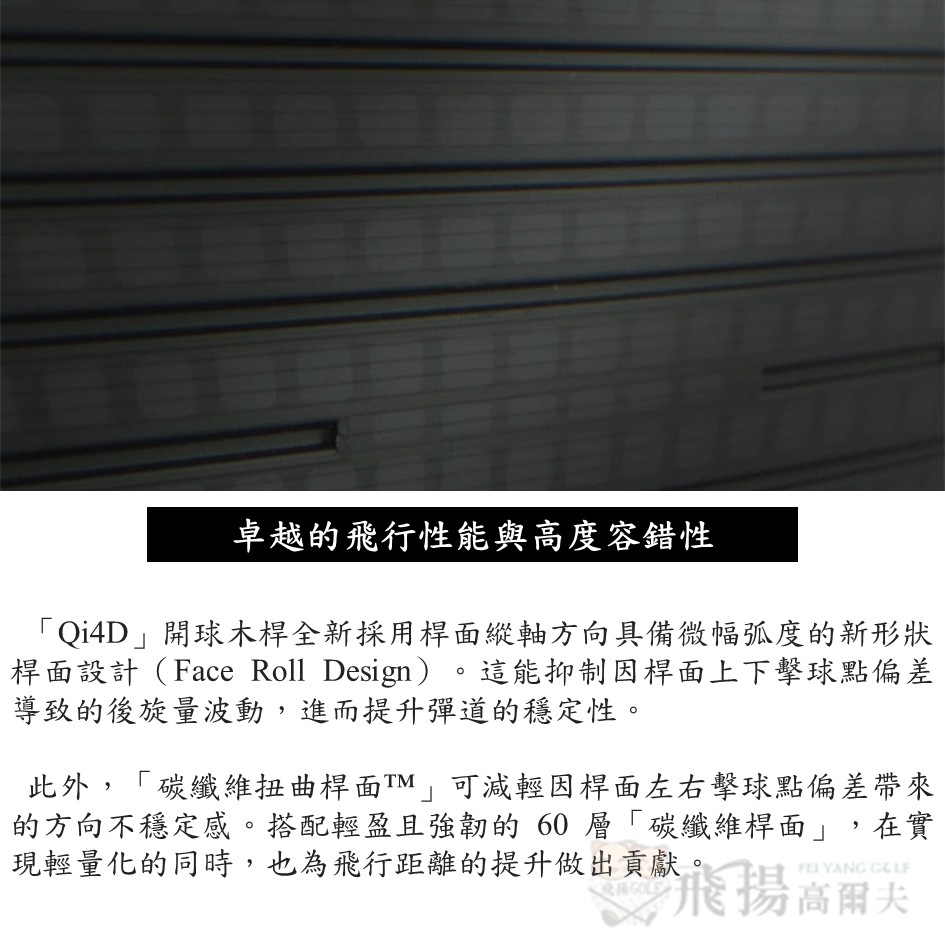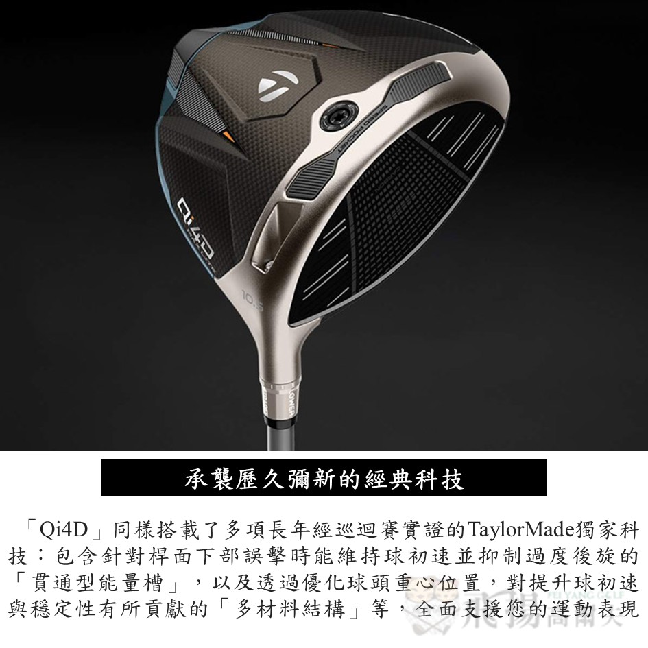 速度的新定義。泰勒梅(TaylorMade)面對其品牌 DNA 中的「飛行性能」,為了追求極致速度而開發出「Qi4D」開球木桿。透過進化的第五代「碳纖維桿面」,不僅提升了飛行距離,更優化了後旋量。此外,進化的球頭形狀可有效降低空氣阻力,進一步提升揮桿速度。除了提供支援各類球員飛行需求的四款型號,再搭配全新的「REAX」桿身,讓您飛行的可能性無限延伸。