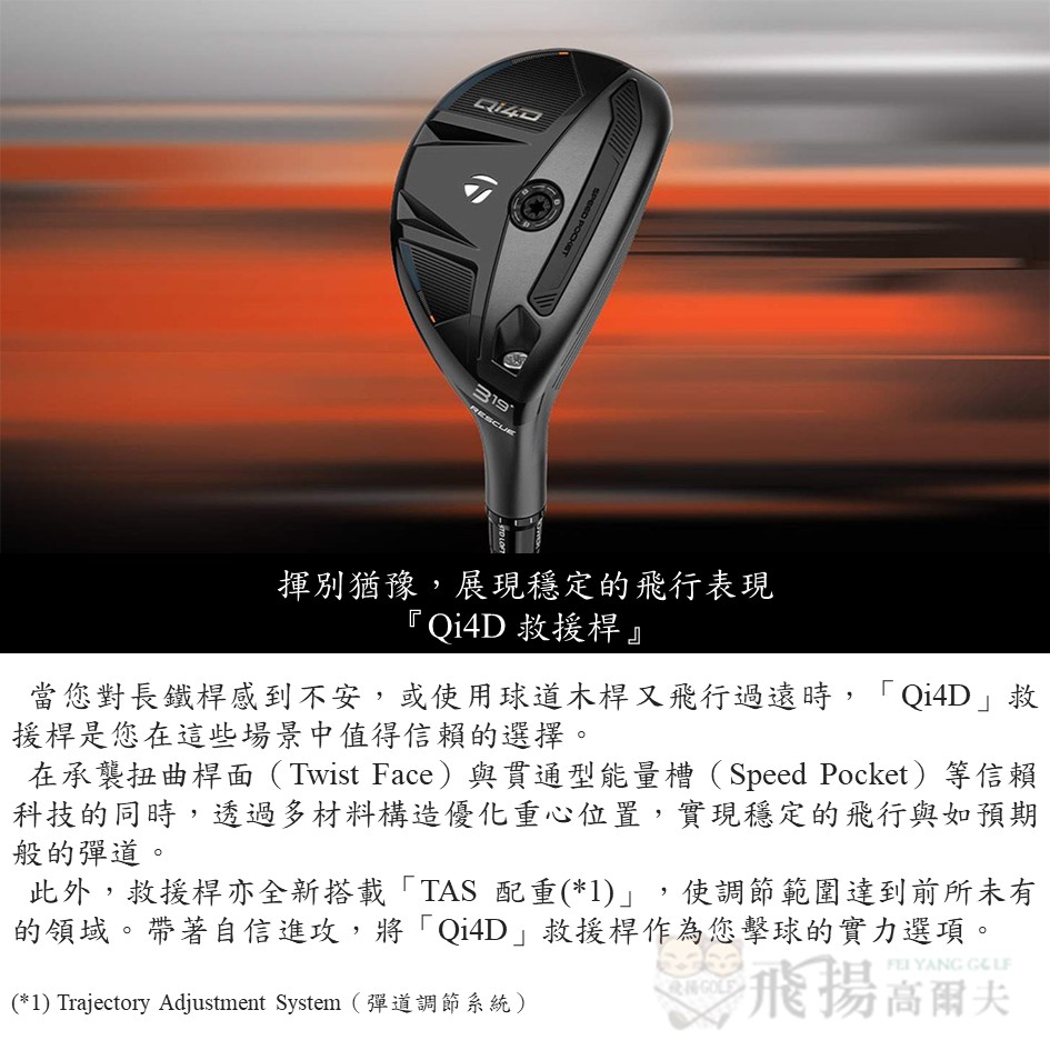 當您對長鐵桿感到不安,或使用球道木桿又飛行過遠時,「Qi4D」救援桿是您在這些場景中值得信賴的選擇。在承襲扭曲桿面(Twist Face)與貫通型能量槽(Speed Pocket)等信賴科技的同時,透過多材料構造優化重心位置,實現穩定的飛行與如預期般的彈道。此外,救援桿亦全新搭載「TAS 配重(*1)」,使調節範圍達到前所未有的領域。帶著自信進攻,將「Qi4D」救援桿作為您擊球的實力選項。