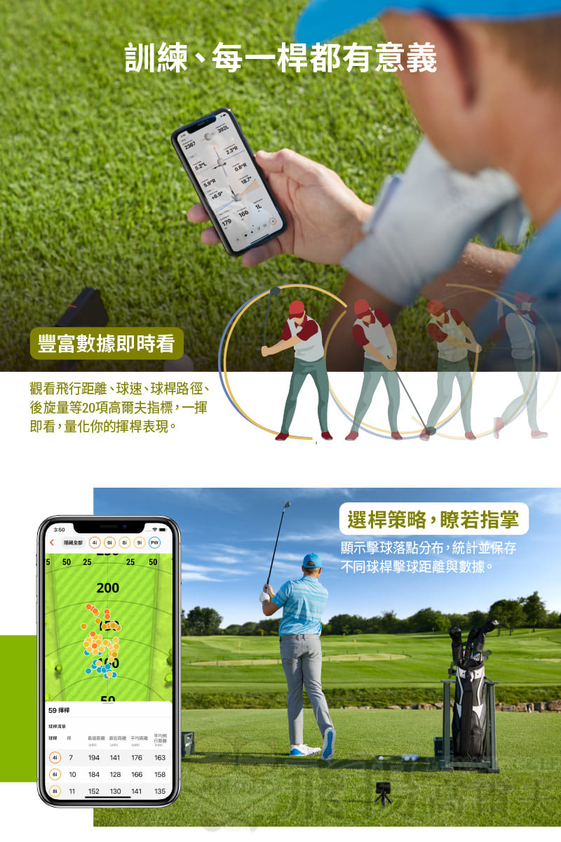 跟踪關鍵數據以提高擊球的一致性,例如桿頭速度、球速、球旋轉、攻角、扣球係數等。