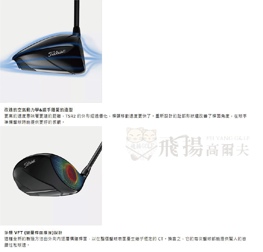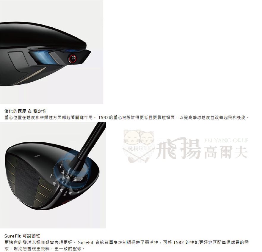 TSR2 發球木桿精簡外形同時提升了速度。對於習慣在整個桿面範圍擊球的球員,它將更顯著的重心調整與全新的多維V FT (變量桿面厚度)技術相結合,提高了整個桿面的擊球速度。這些都集成在一個更簡潔、精練的外形之中,更能激發球手的信心。