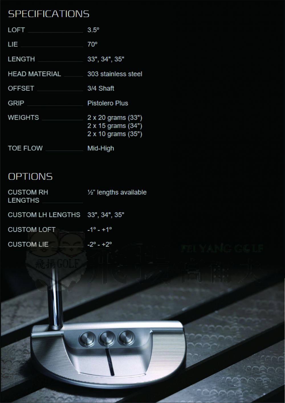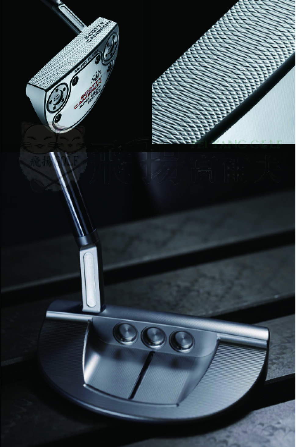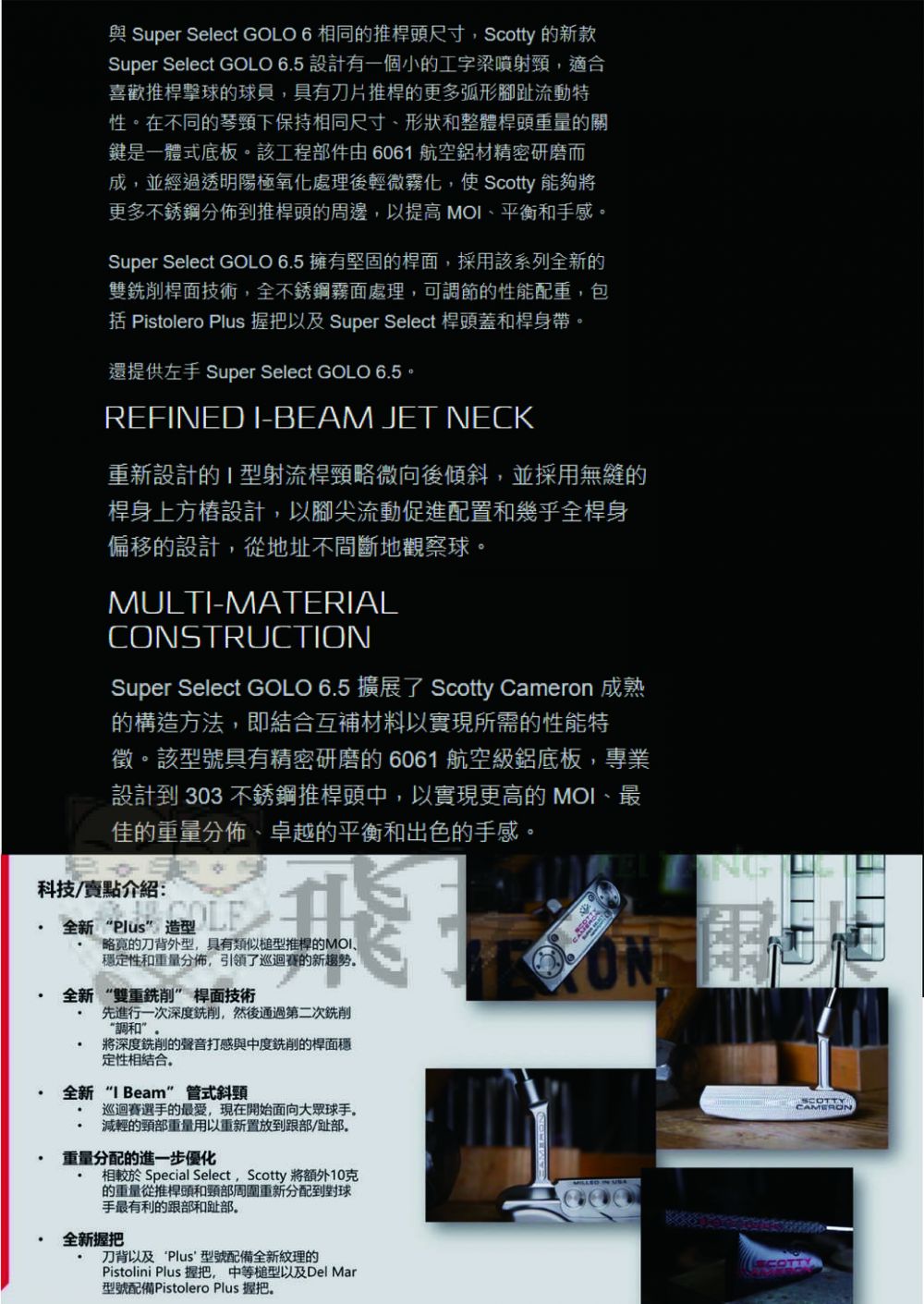 與 Super Select GOLO 6 相同的推桿頭尺寸,Scotty 的新款 Super Select GOLO 6.5 設計有一個小的工字梁噴射頸,適合喜歡推桿擊球的球員,具有刀片推桿的更多弧形腳趾流動特性。在不同的琴頸下保持相同尺寸、形狀和整體桿頭重量的關鍵是一體式底板。該工程部件由 6061 航空鋁材精密研磨而成,並經過透明陽極氧化處理後輕微霧化,使 Scotty 能夠將更多不銹鋼分佈到推桿頭的周邊,以提高 MOI、平衡和手感。