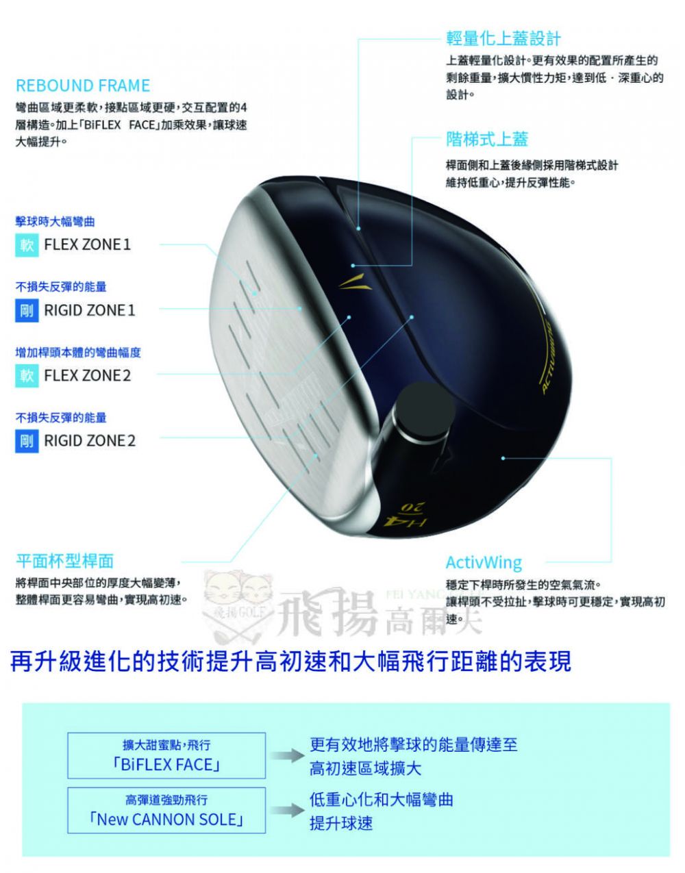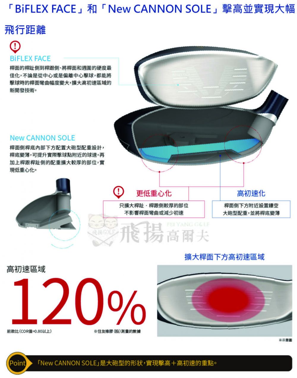 "新"技術「BiFLEX FACE」及 "進"化技術「New CANNON SOLE」"引導高又強勁彈道的混血木桿。