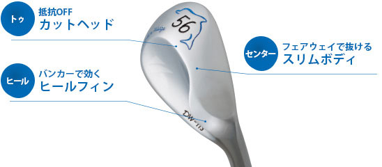カットヘッド 不要な抵抗をなくすため、ソールトゥ部のパスをカット。 カットした重量をセンターからトゥ側に配分することでトゥ側でのショットにもしっかり対応。 スリムボディ ソールセンター部は、ソール幅とバランス角を適切に設定することでフェアウェイやラフからのショットに対応 ヒールフィン 独特のソールヒール部形状は、エクスプロージョンショット時にヘッドが砂に潜ることを防ぎ、スイング方向へとクラブを自然に導く。 スイングを変えることなくやさしくバンカーからの脱出をサポート。 フェースを開かなくてもソールが機能し、ヘッドが抜ける。 フィン:魚のひれ、足ひれ、サーフボードのした面にある、ひれ状の方向安定版。【形状の意匠登録済み】 |