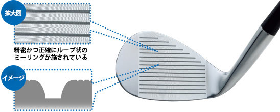 ファイルループミーリング フェース表面を精密にミーリングすることでフェース面の平滑度が高まりショットが安定する。 彫刻溝加工 大きくアールを付けた逆さ富士型の溝は、スピン性能を最大限に発揮できるようテストを重ね、開発した理想的な溝形状。通常ショットに加えて、特に5~10ヤードの短いアプローチで威力を発揮する。【新溝ルール適合 |