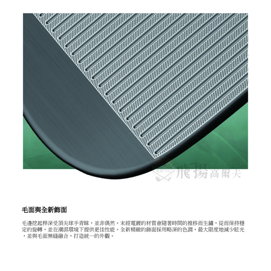 桿面溝槽之間加入獨特傾斜的斜紋雷射雕刻工法,藉以形成特殊凹槽通道,讓水分在擊球時能順利排出,保持在潮濕環境下的倒旋效果