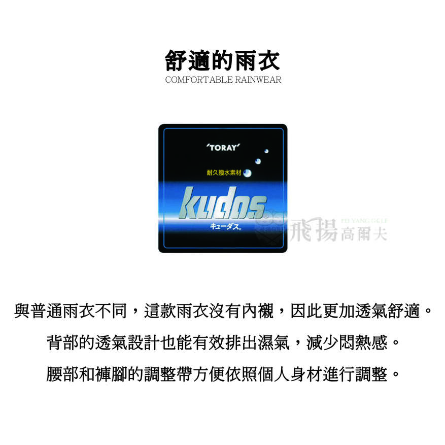 • 這款輕巧又柔軟的設計,減少了雨衣常見的摩擦聲,更加安靜。同時採用了易於活動的落肩袖設計,讓揮桿更加容易。
