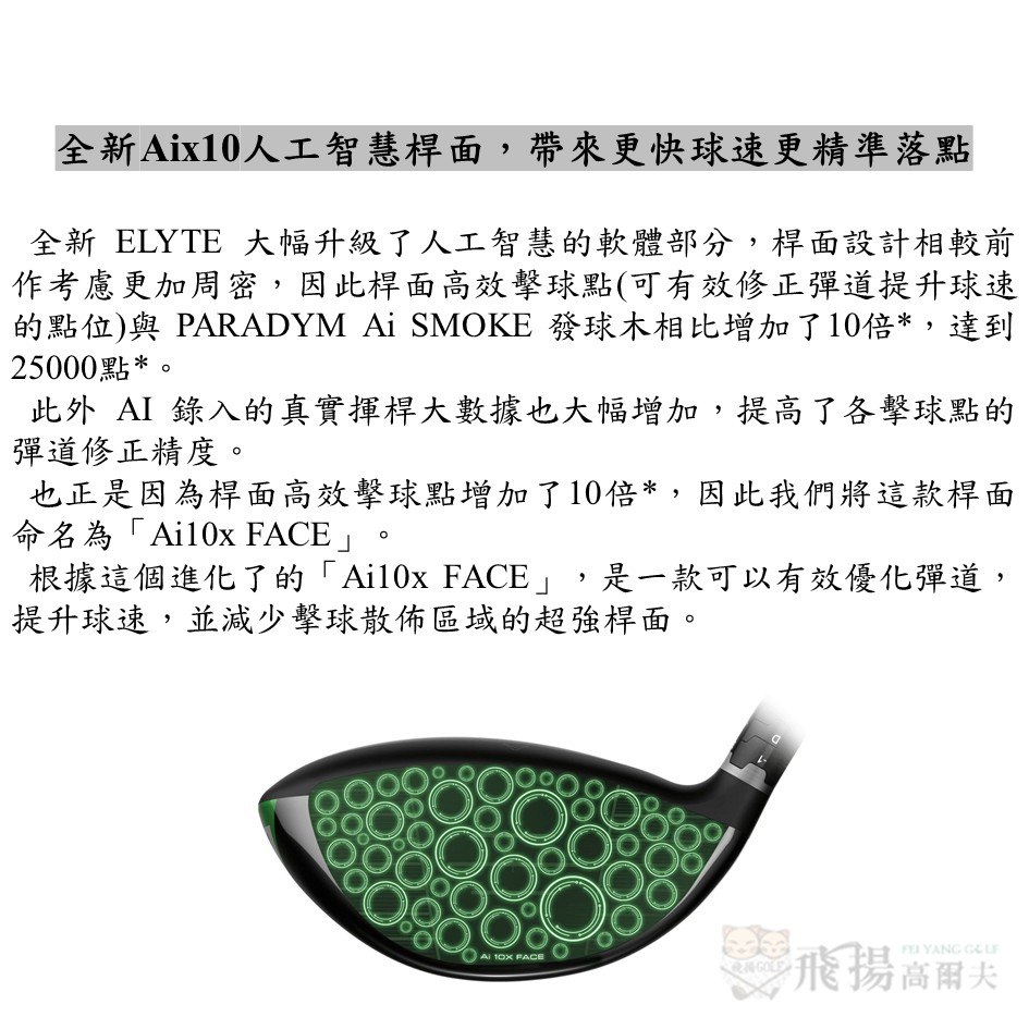 卡拉威2025年式ELYTE系列突破性的將高容錯與高球速完美結合。促成這傑作的主要部件就是全新Ai x10人工智慧桿面,這款桿面上的高效擊球點數量是AiSMOKE發球木桿面的十倍*。