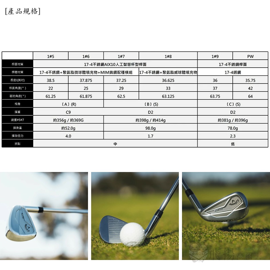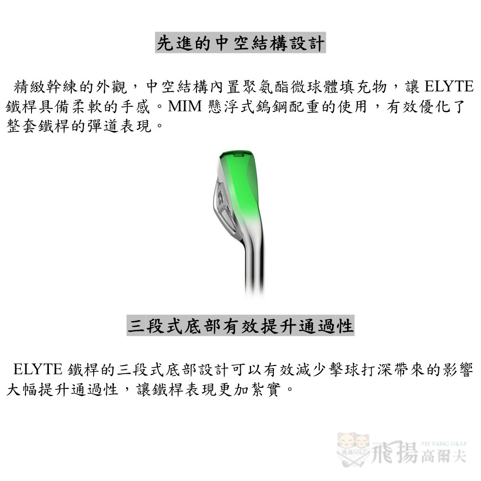 全新 ELYTE 鐵桿是 CALLAWAY 在複合材質高性能鐵桿領域的又一重大技術突破。採用先進的 Aix10 人工智能桿面,這款鐵杆系列擁有超快的球速和卓越的容錯性,助力球手實現穩定擊球。中空設計內置聚氨酯微球體填充物,為球手提供柔軟的擊球手感,無論是擊球的舒適度還是反彈效果都表現出色。此外,內置 MIM 懸浮式鎢鋼配重模組進一步提升了 ELYTE 鐵桿的彈道表現與易打性,讓每一位球友都能輕鬆駕馭這款全面優秀的鐵桿系列。