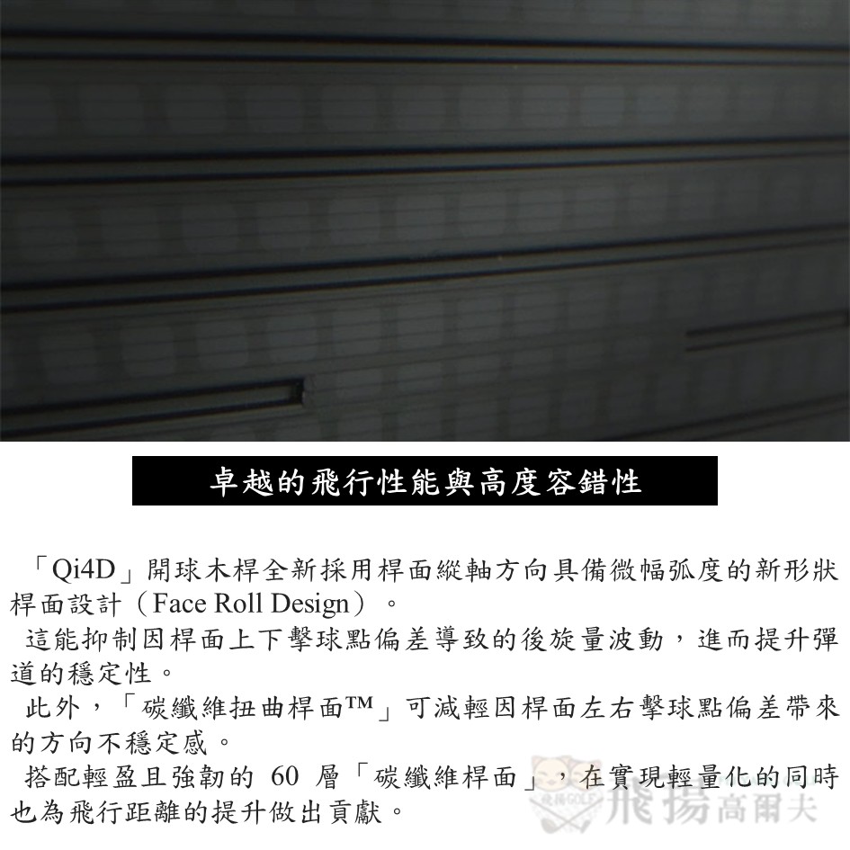 速度的新定義。泰勒梅(TaylorMade)面對其品牌 DNA 中的「飛行性能」,為了追求極致速度而開發出「Qi4D」開球木桿。透過進化的第五代「碳纖維桿面」,不僅提升了飛行距離,更優化了後旋量。此外,進化的球頭形狀可有效降低空氣阻力,進一步提升揮桿速度。除了提供支援各類球員飛行需求的四款型號,再搭配全新的「REAX」桿身,讓您飛行的可能性無限延伸。