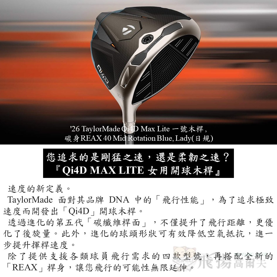 【飛揚高爾夫】'26 TaylorMade Qi4D Max Lite 一號木桿 ,碳身REAX 40 Lady(日規)