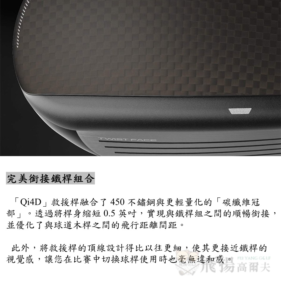 當您對長鐵桿感到不安,或使用球道木桿又飛行過遠時,「Qi4D」救援桿是您在這些場景中值得信賴的選擇。在承襲扭曲桿面(Twist Face)與貫通型能量槽(Speed Pocket)等信賴科技的同時,透過多材料構造優化重心位置,實現穩定的飛行與如預期般的彈道。此外,救援桿亦全新搭載「TAS 配重(*1)」,使調節範圍達到前所未有的領域。帶著自信進攻,將「Qi4D」救援桿作為您擊球的實力選項。